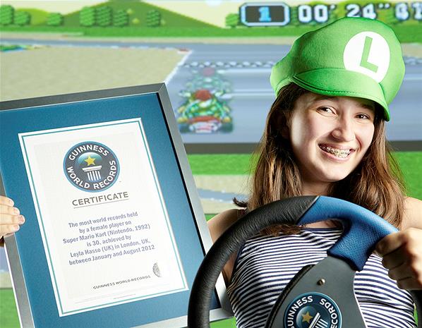Following her uncle Sami's entry in the Guinness World Record books the previous year, Leyla had the opportunity for an entry into the 2013 Gamer's Edition book for holding more Super Mario Kart World Records for a female gamer than any other. A photoshoot was done in 2012 and this has been included into the book with Leyla wearing a Luigi hat (the L also conveniently standing for her name).