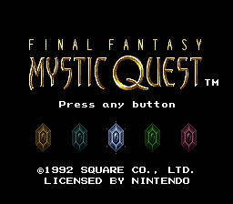 Final Fantasy Mystic Quest is an Action/RPG released in October of 1992 by Square for the Super Nintendo Entertainment System. The game made it to Europe the following year under the title Mystic Quest Legend, then was released in Japan as Final Fantasy USA: Mystic Quest.